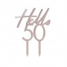 Topper in plexiglass rose gold "HELLO 50" per dare il benvenuto ai 50 anni! Dimensione 10cm x 13cm.