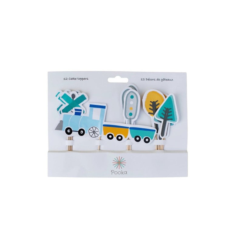 Set di 12 stecchini con sagome in cartoncino di trenino, semafori e alberi.