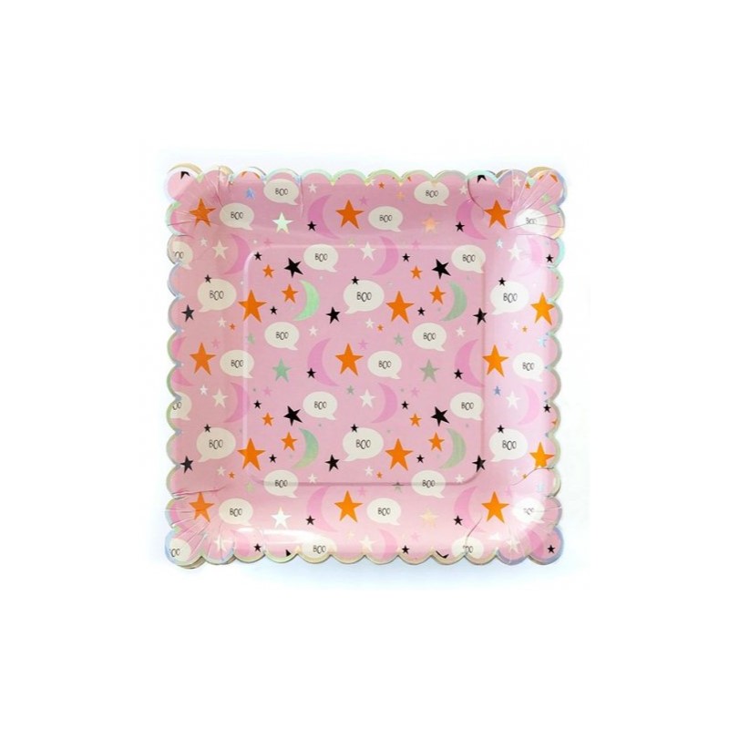 Teneri piatti quadrati e smerlati con dettagli argento per rendere unica e dolce la tua tavola di Halloween!