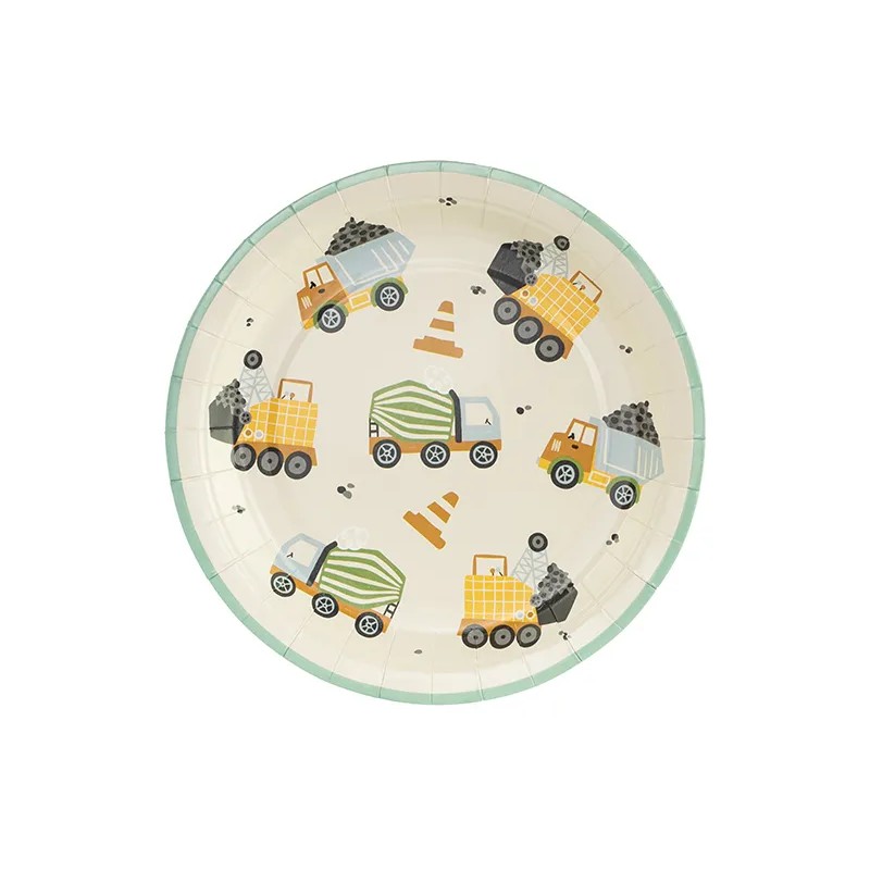 Dolci piattini di carta con fantasia di mezzi da lavoro per una festa tutta da costruire!