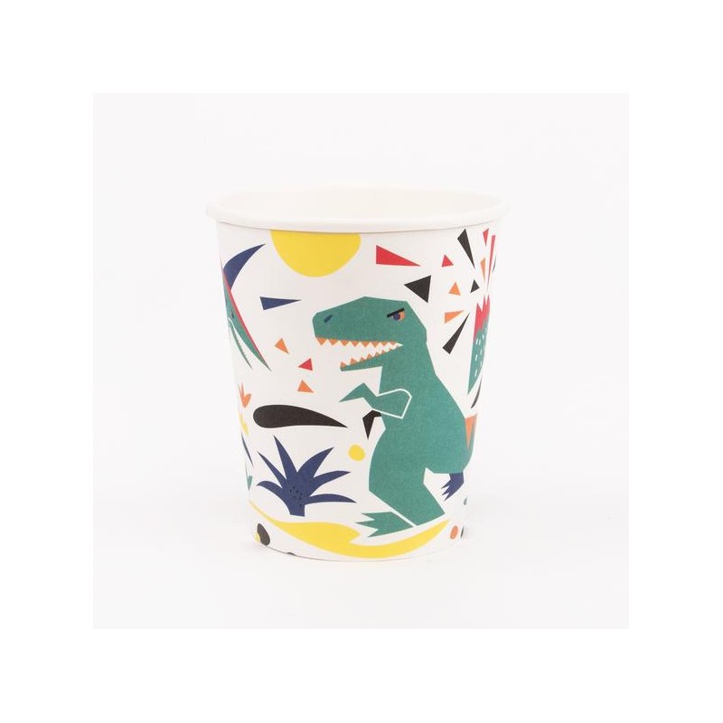 Bicchieri di carta con fantasia di dinosauri dall'effetto fumetto.