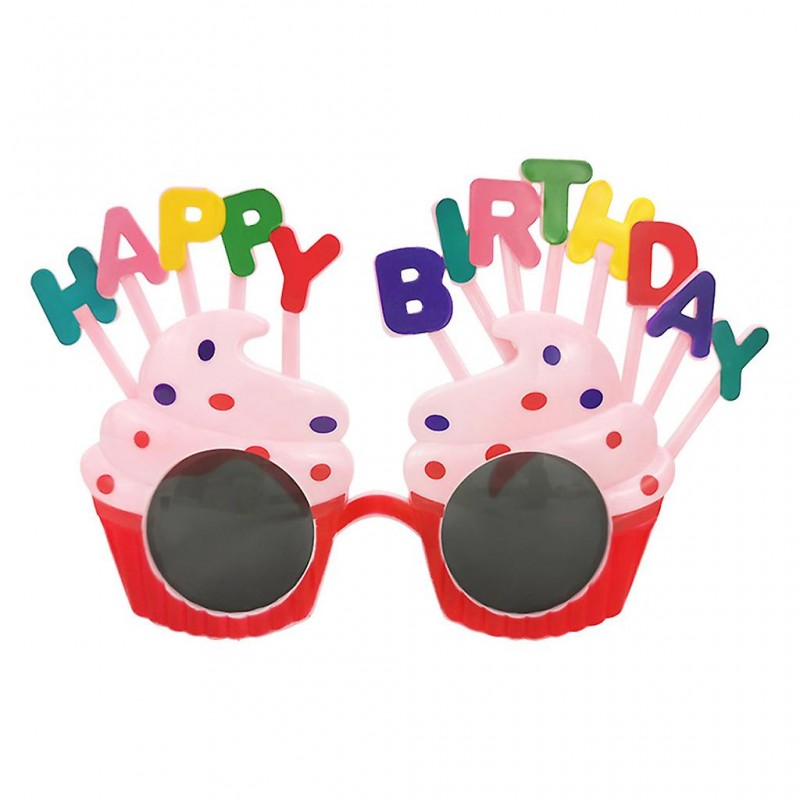 Occhiale a forma di cupcake con scritta "HAPPY BIRTHDAY" in plastica rosa con lente nera.