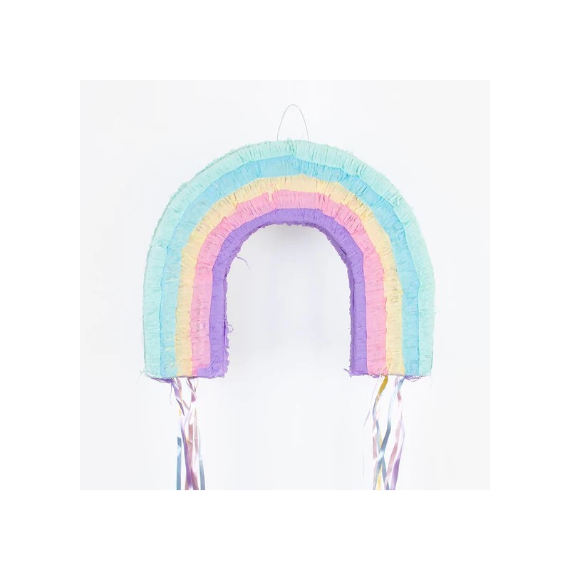 Colorata piñata a forma di arcobaleno dai toni pastello.