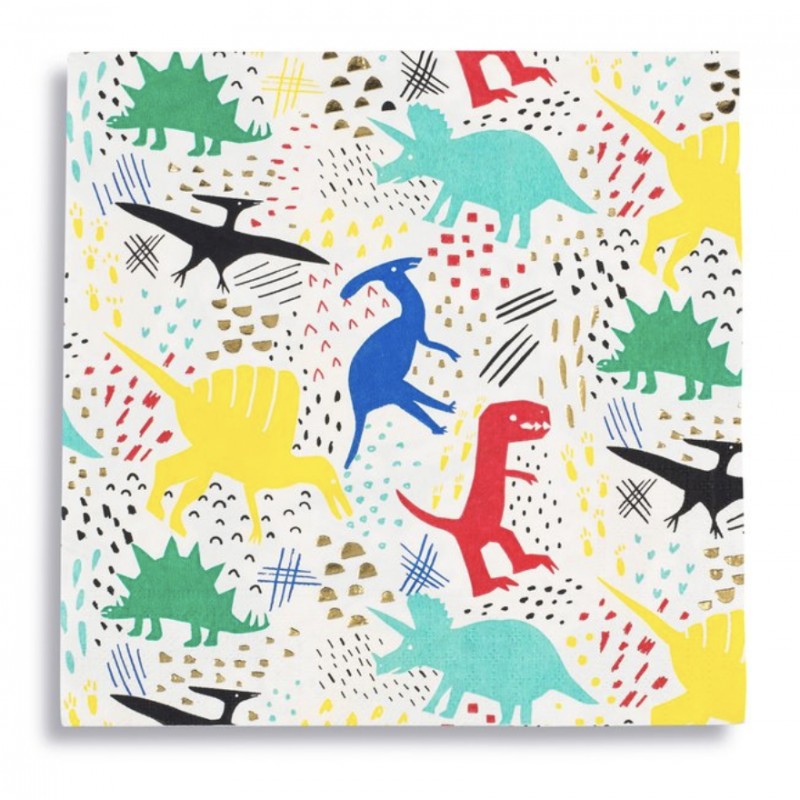 Tovaglioli quandrati con fantasia di dinosauri colorati.
