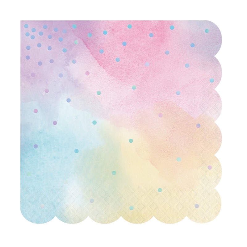 Coloratissimi tovagliolini da cocktail smerlati a pois iridescente e dall'effetto acquerello.