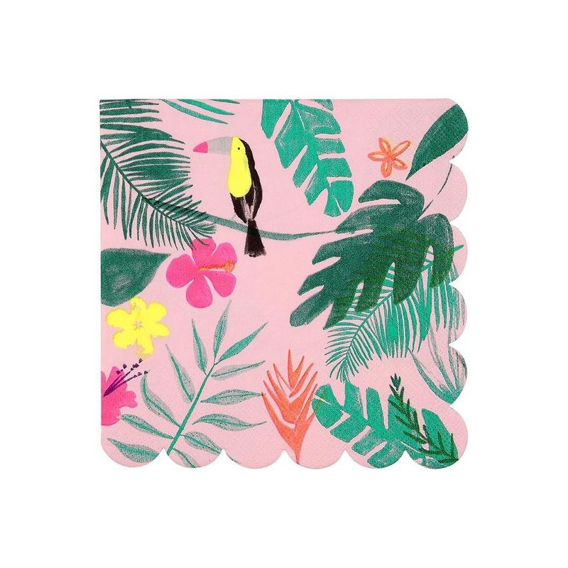 Tovaglioli quadrati e smerlati con fantasia di tucano e foglie tropicali.